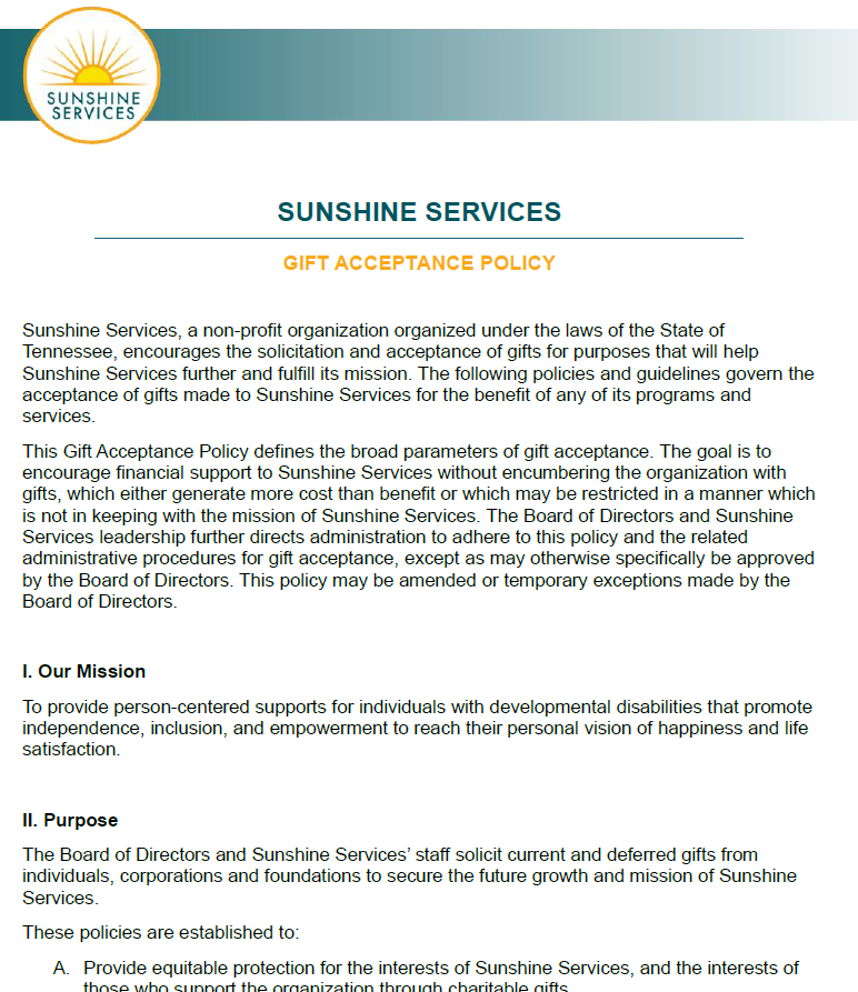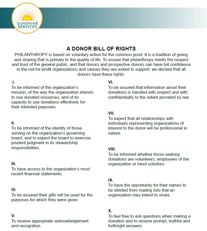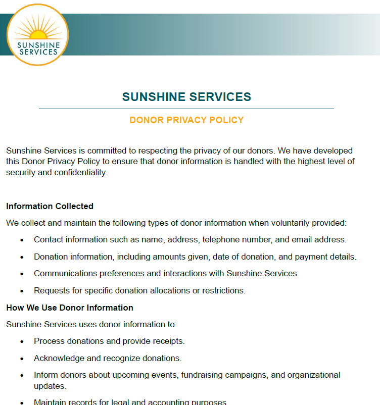 At Sunshine Services, we are dedicated to maintaining the trust and confidence of our donors. Below you’ll find key policies that ensure your privacy, security, and understanding of how your contributions support our mission. Please review these policies to learn more about how we handle your donations and personal information.